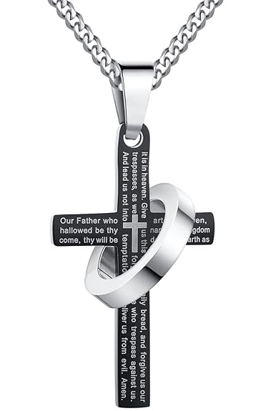 Stainless Steel Men’s Cross W. Lord’s Prayer in English and Halo Ring Pendant Necklace with Curb Chain (Black and Silver Color). Stainless Steel Jewelry is one of the strongest of all jewelry metals, it does not oxidize and it can endure long time wear and tear. Stainless steel will not rust and requires little or no maintenance to keep it looking new.